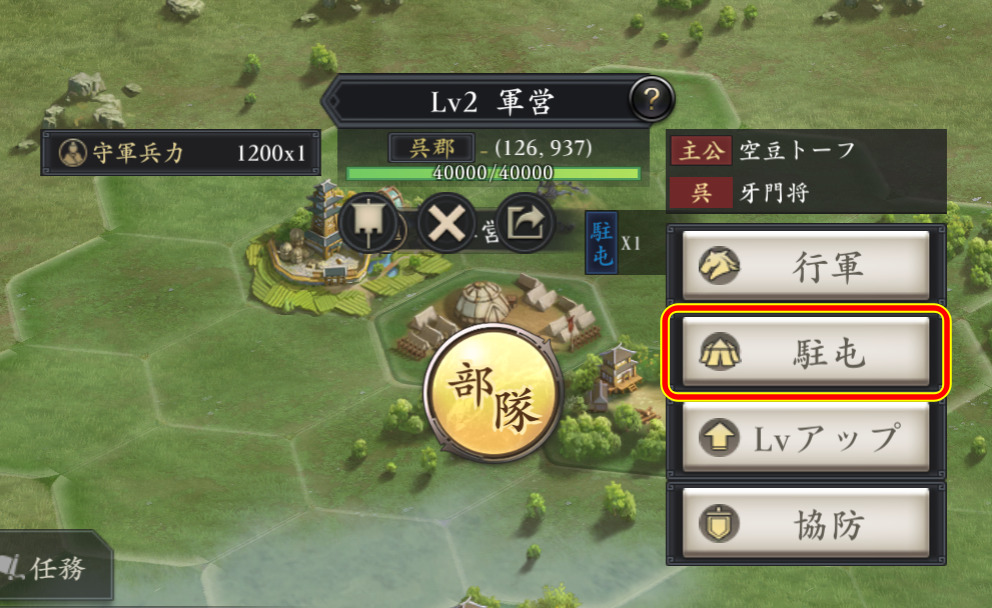 表示されるメニューから「駐屯」を選択します。