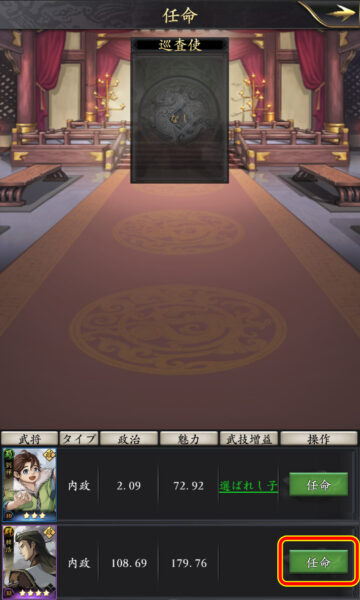 各機能(資源や貿易、巡査等)に対して、内政タイプの武将を任命することで、生産量や高級報酬を入手できる確率等を上昇させます。