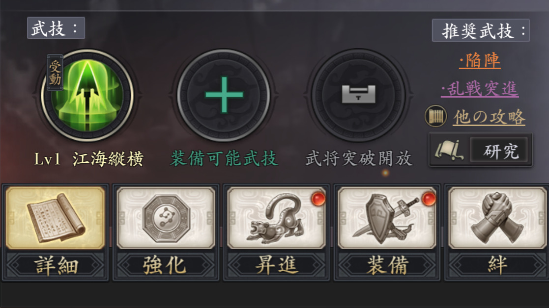 研究とは、武将を消費して、その武将が持っていた武技を...