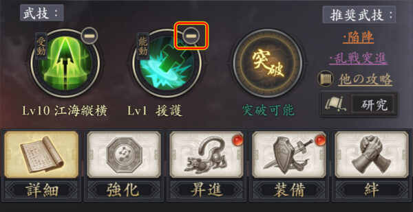 武技を外したい武将の詳細画面を開き、外す武技のアイコン右上の「-」をタップします。