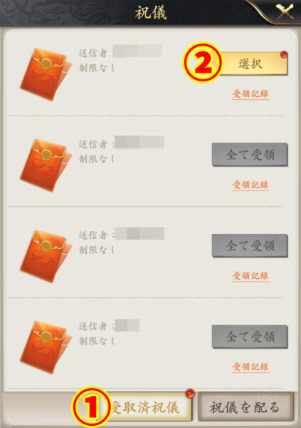 祝儀を受け取る場合は、「受取済祝儀」を選択し、「選択」をタップします。