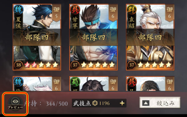 武将画面左下の「プレビュー」アイコンを選択します。
